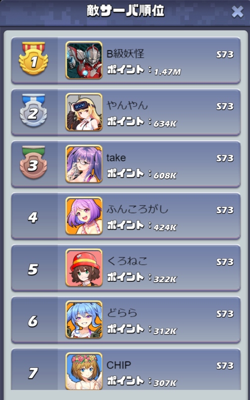連盟ランキングの上位10位までの合計:S73サーバーのほうが上